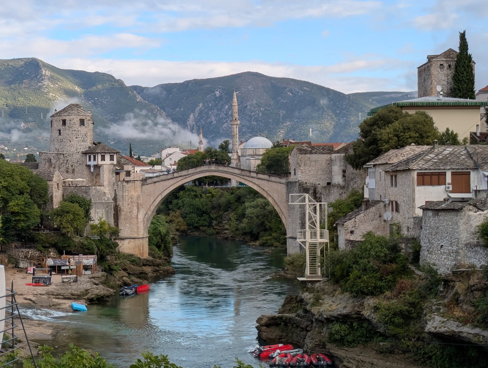 And then yesterday we visited the city of Mostar, in neighbouring Bosnia-Herzegovina. This city too, brims with life and energy, built along the banks of the beautiful Neretva River that flows through its centre (with a little more force today after fierce storms lashed the region overnight). We walked with a local guide visiting street art in the city, along the way encountering the damage still evident here from that same war – where opposing forces faced off across the river, hurling destruction at one another. Where Dubrovnik’s old city has been largely rebuilt, here that’s not yet always the case – streets and buildings stand as mere shells, bearing witness to the horrors that happened here in the 90’s. Beautiful street art calls the city to new life, right across the street from crumbling hulks that 30+ years on tell a story.